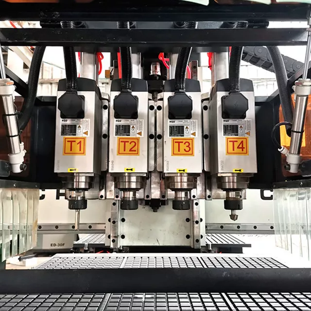 Máy được trang bị bốn trục chính làm mát bằng không khí hoạt động độc lập, chuyển đổi bằng khí nén, cho phép thay đổi nhanh giữa các công đoạn cắt, phay rãnh và khắc mà không cần can thiệp thủ công.